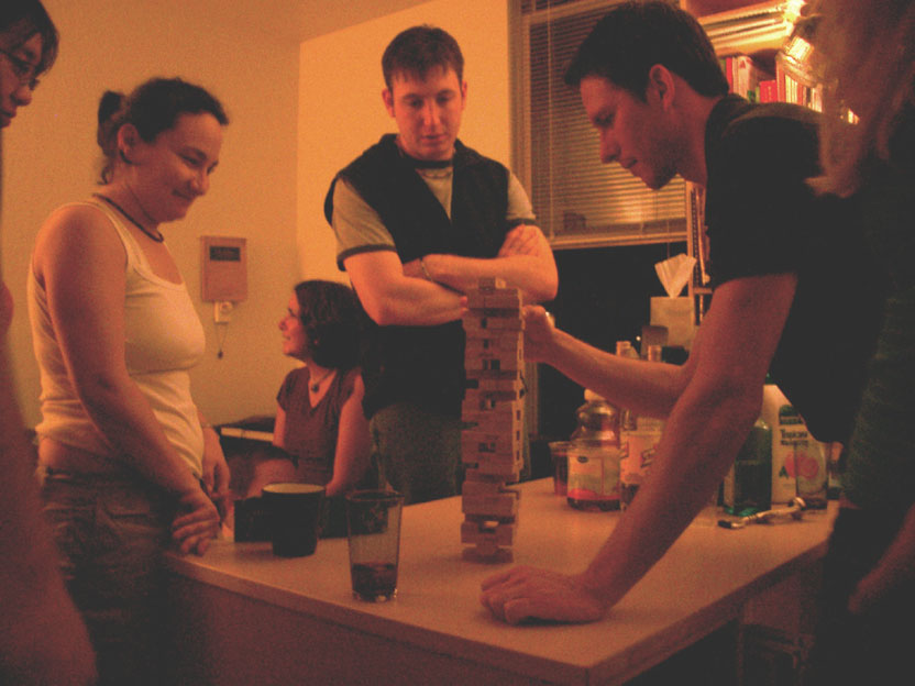 previous back next   it wasn't long before jenga came out--Jennifer, Leslie and Matt watch the masterful Eric