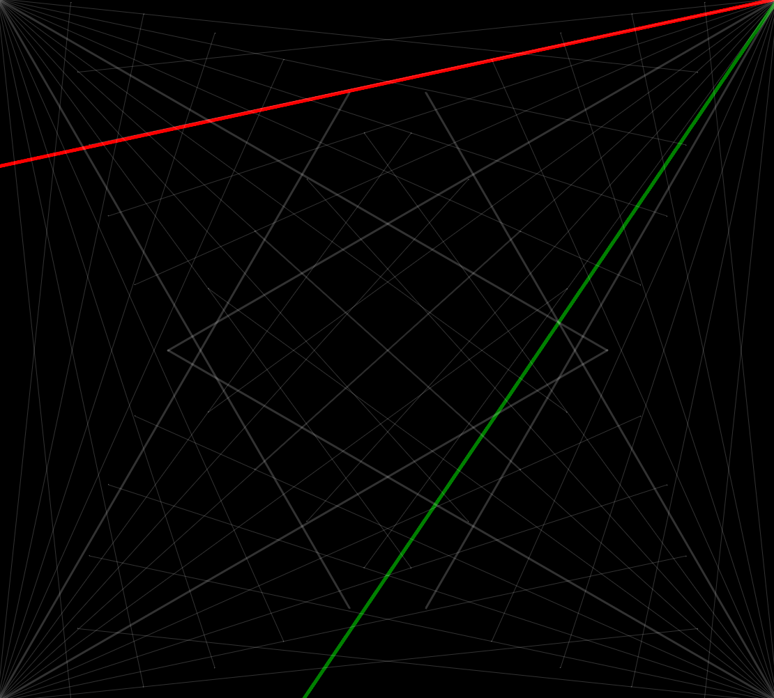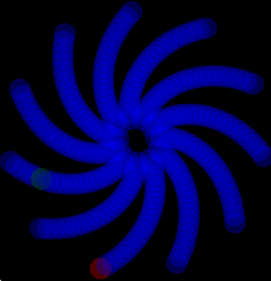 | 240 circles start the hour all lined up top to middle, in a line. Then, the top (red) circle goes around in a circle once an hour. The second circle goes around twice an hour. The 60th circle goes around once every minute (and is colored green). The circle closest to the middle goes around 240 times per hour, or once every 15 seconds. The cool thing is that any time you reach a fraction of an hour, the number of "legs" of the star-shaped monster will be the denominator of the fraction. At 1/2, it'll have two arms. At 1/3 it'll be three (every 20 minutes). At the quarter hour there are four legs, etc. There's also faster version with 1800 circles |