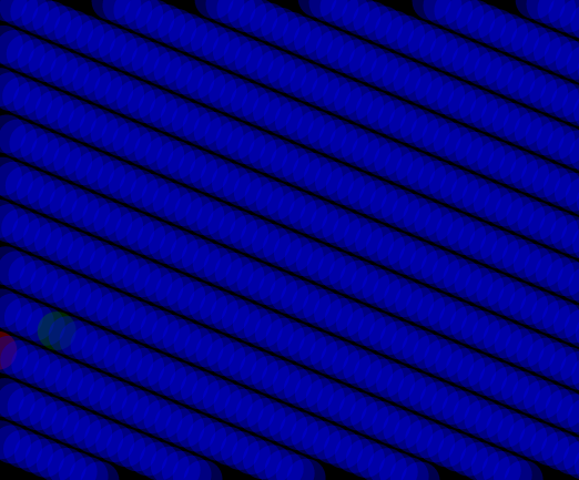 | 600 circles start the hour all lined up across the top, in a line. Then, the top (red) circle falls once an hour. The second circle falls twice an hour. The 60th circle falls once every minute (and is colored green). The circle closest to the middle goes around 600 times per hour, or once every 6 seconds.