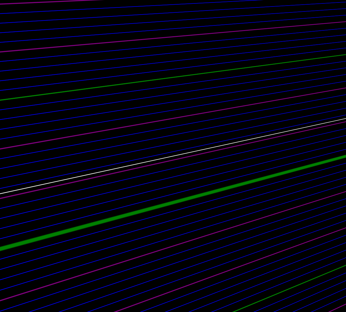 | Just an hour hand slowly making its way around the clock face twice a day, but zoomed in. Red lines are hour markers, green are half and quarter hours, purple marks 5 minutes, and blue one minute. (Sped up? Okay.) |