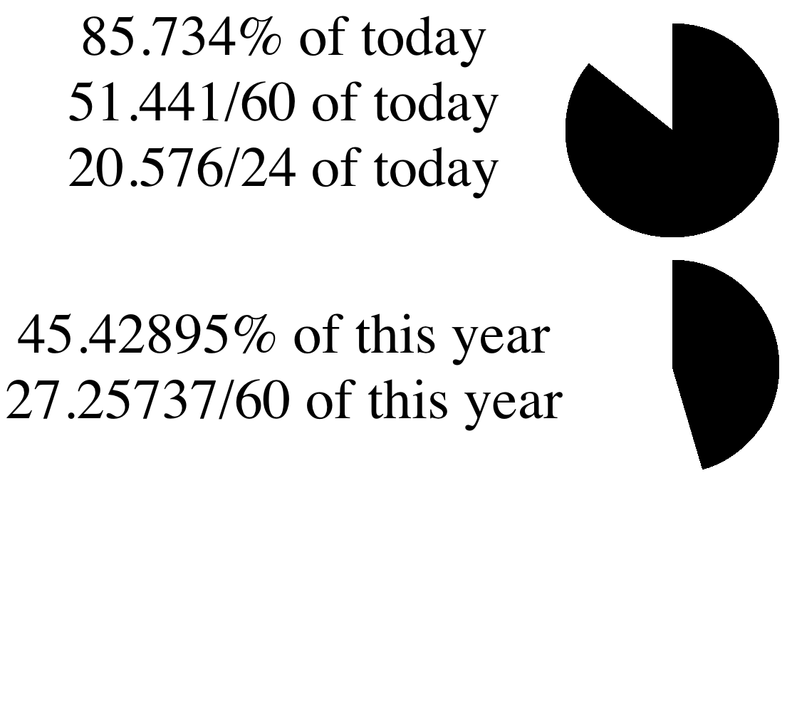 There's also slower version with 1440 circles: Red falls once a day, the 24th circle (green) falls once an hour, and the 1440th circle (white) falls once a minute. |