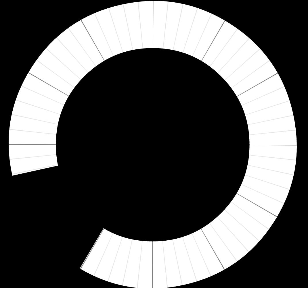 | Here, instead of an arc, the time is drawn as a pie, again from the hour hand to the minute. But the pie is drawn twice - one positioned so you're zoomed in on the minute hand, and one so you're zoomed in on the hour hand. It's really trippy when they meet. There's a sped up version of this one, too. :) |